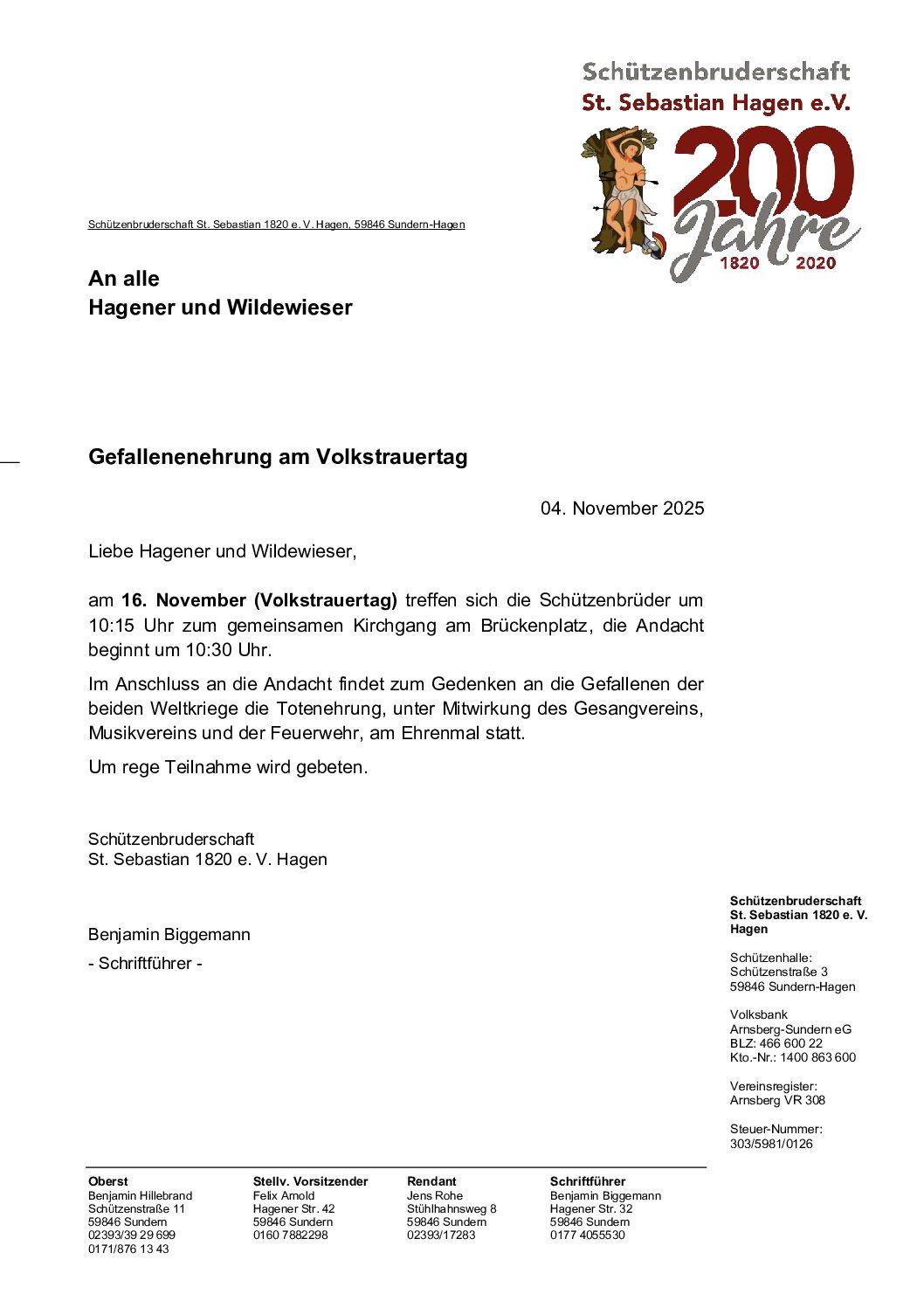 Am 16. November (Volkstrauertag) treffen sich die Schützenbrüder um 10:15 Uhr zum gemeinsamen Kirchgang am Brückenplatz, die Messe beginnt um 10:30 Uhr.